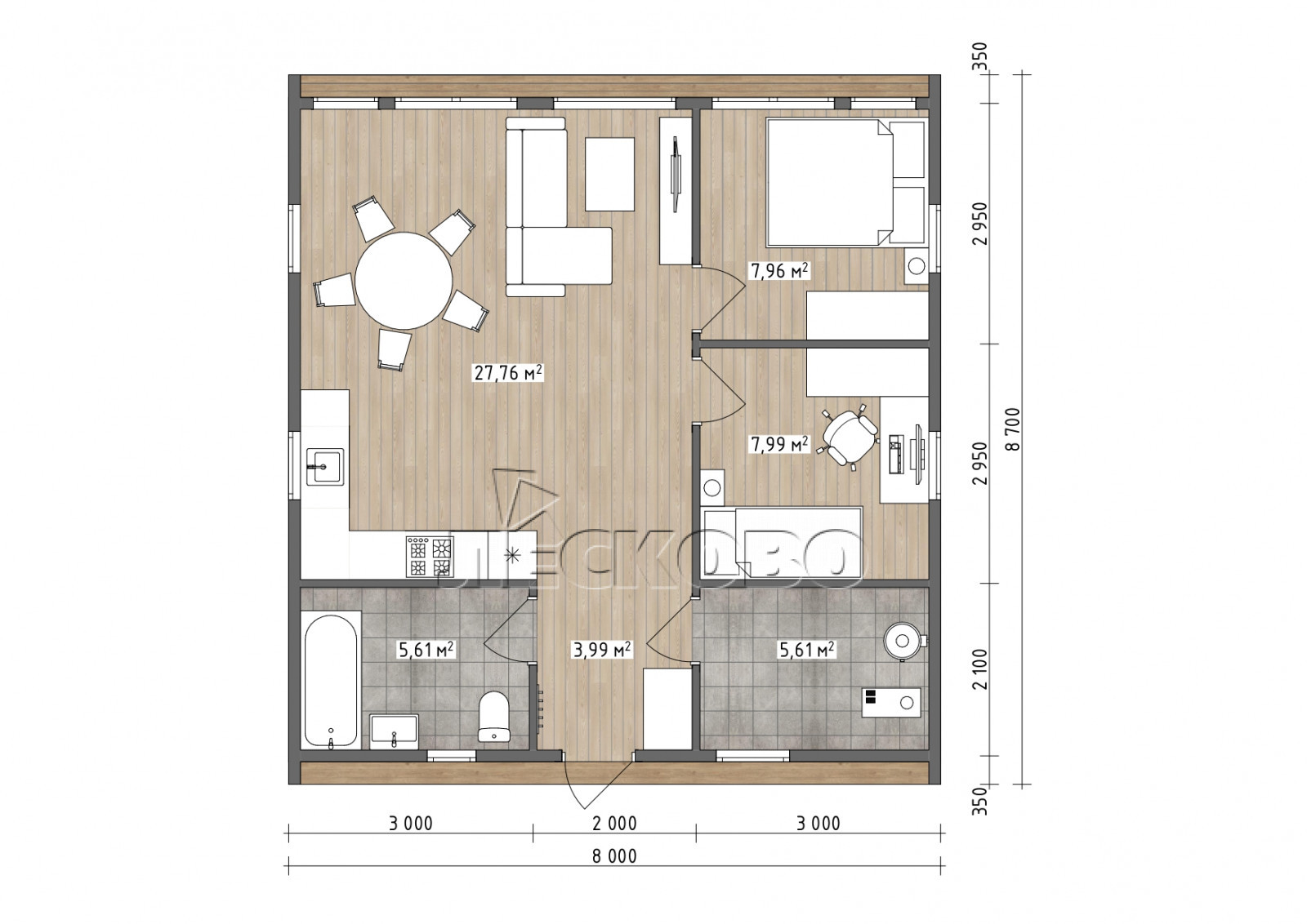 • Стены: каркас заводского изготовления из калиброванной доски 44х144 мм / 44х94 мм камерной сушки 12-14%,(костромская ель, сосна)