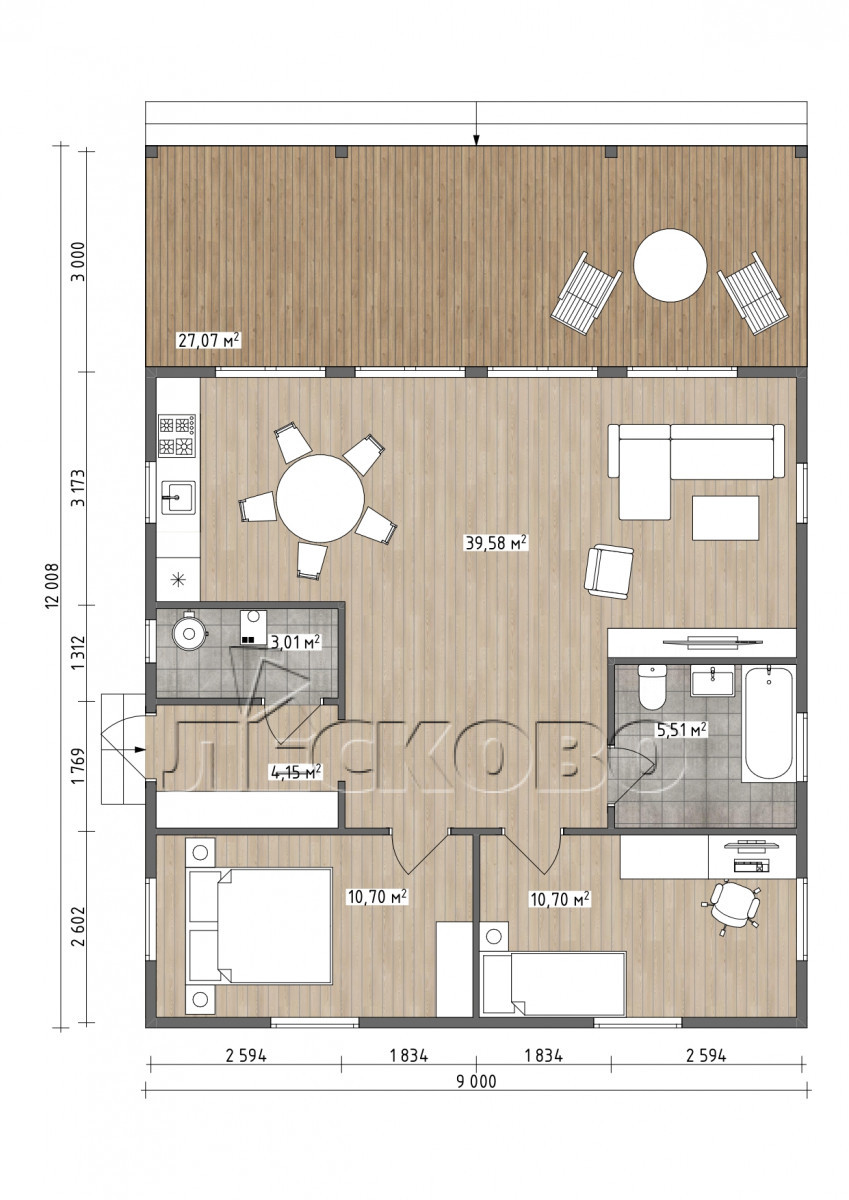 • Чистовые полы на верандах и балконах: палубная доска 35х144 мм сорт АБ,